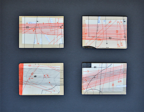 Streckenabschnitt 1 - 4, Tusche, Buntstift auf Collage, je 10 x 14cm, 2022